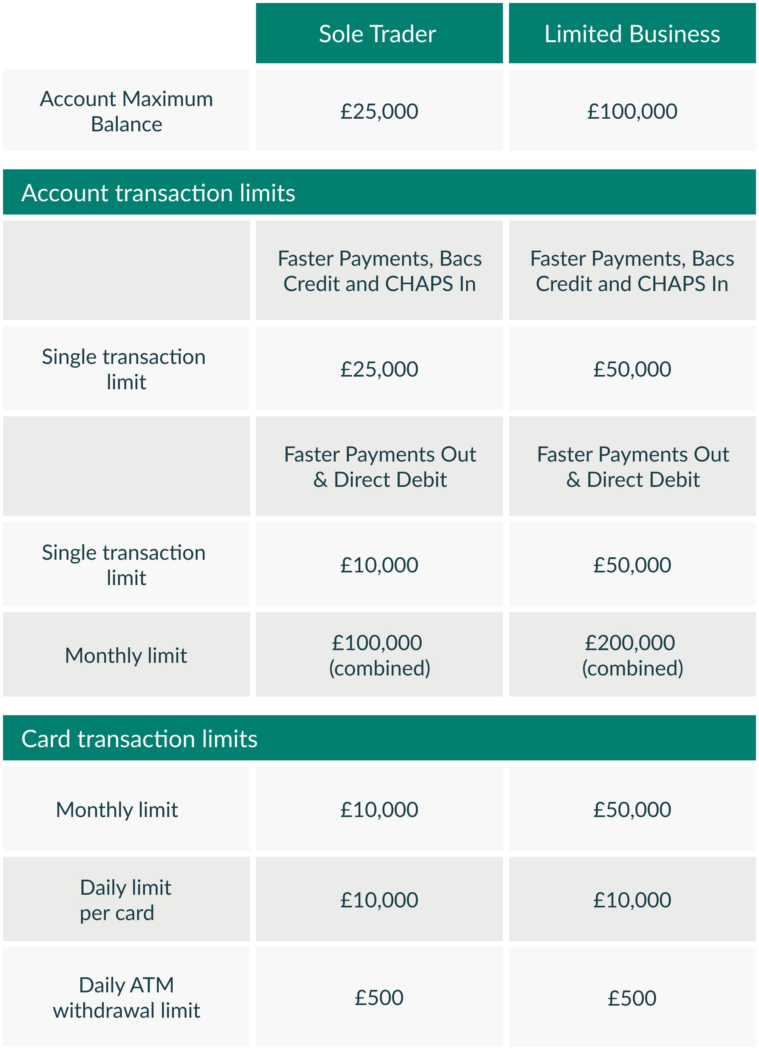 For your security, Tide accounts are initially subject to the balance and transaction limits shown below.